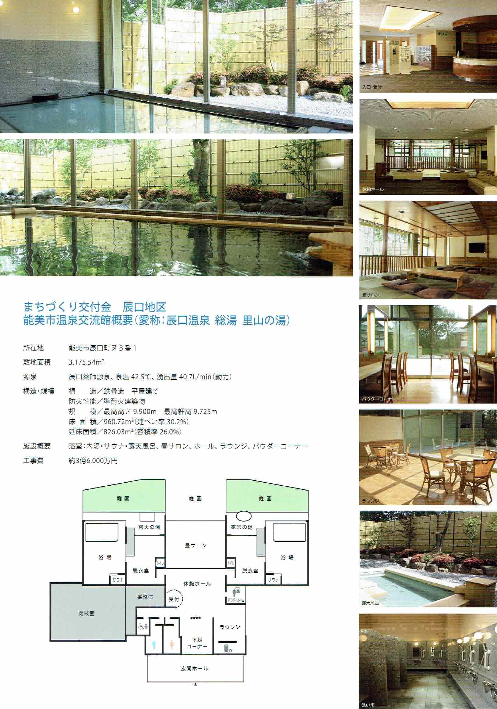 内湯の主浴槽は熱めの温泉。 露天風呂は時期により入浴剤が投入されている等、温泉の利用方法に疑問あり。 健康福祉センター・デイサービスセンターが併設されており、館内にはカラオケボックスやフィットネスジムまであり、夜11時までの営業と地域住民の為の総合施設