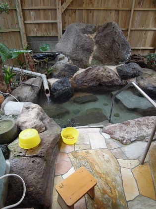 露天風呂は岩風呂と檜風呂の2つ、薄黄緑の温泉が注がれている。 温泉は加温されて41.5度位に調整されていて熱め。 壺湯は純米酒風呂となっていて、お酒は定期的に追加投入される。 施設内は所狭しと、土産物やゲーム機・ガチャポンが置かれており、ゆったり感はなく湯上がりに落ち着けない。 もう少しゆったりとした無駄な空間があれば、湯上がりに落ち着けるのだが。