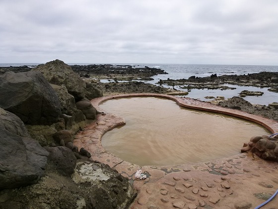 浴室は2階にあります。眺望を期待していたのですが、目隠しのために窓にはミラーフィルムが貼られており、紫がかった窓越しの風景で開放感はありません。 露天風呂へは階段を降りて向かいます。 露天風呂も2m程の高さの目隠しの為に開放感は全くありません。 泉質は強塩泉で、熱めに設定されていたので、良く温まりました。 地元のお年寄りの方が、多く訪れておりましたが、施設には階段が多く、新しい施設にしてはバリアフリーとは対局の施設となっていました。 洗い場も奥まった所に設置されており、熱気がこもっておりました。 カランの位置が異常に高く、足を洗おうと頭を下げると、カランに頭をぶつけてしまいました。 鏡下の石鹸おきスペースが狭く石鹸箱すら乗らない等、施設自体はなんとも使いでの悪いものですが、温泉自体はよいものでした。 少し離れた場所にある、足湯は浸かりながら海が眺められるとの事でしたが、この日は窓が曇ってしまっていて眺められませんでした。
