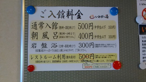 2019年4月に露天風呂を併設してリニューアルしたため入浴料が値上げ。 曜日に関係なく大人800円、子ども600円。 ゴールデンウィーク、お盆、年末年始など特定日は大人950円、子ども750円。 月曜・火曜が休みに変更。