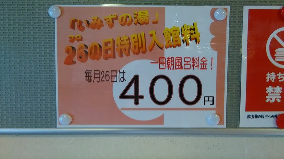 3月26日に朝風呂(400円)へ行ってきました。 オープンしてから初めての26日、26日は風呂の日で通常入館料500円のところ、終日400円と券売機に書いてありました。なんか、少し損した気分になりました。